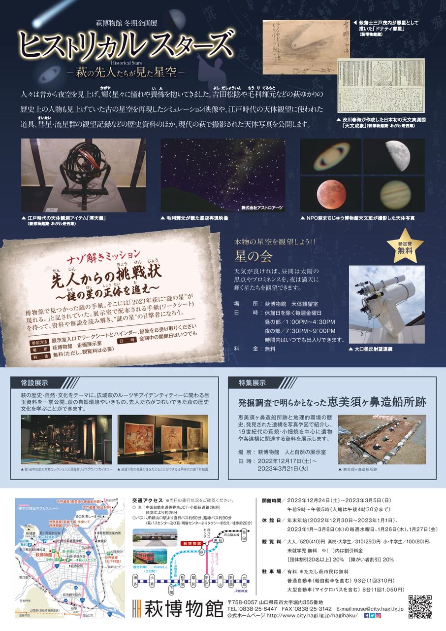 本日ご紹介するのは、クリスマスイブから始まる萩博物館さまの冬季特別展ヒストリカルスターズ―萩の先人たちが見た星空―です。