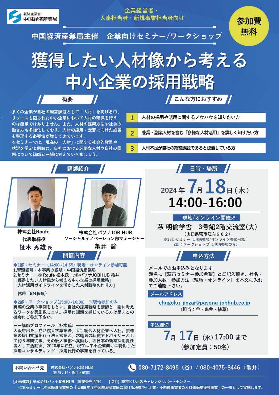 7月18日(木)に、中国経済産業局主催「獲得したい人材像から考える中小企業の採用戦略」が開催されます📣✨