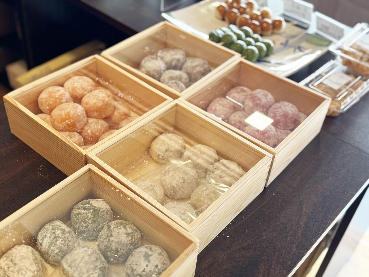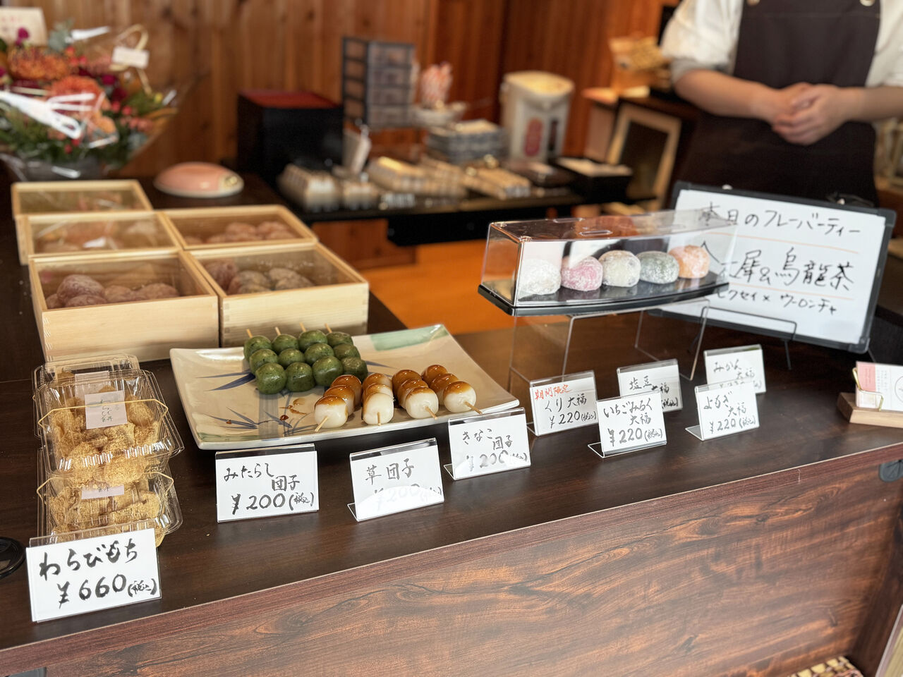 大福(5種)・お団子(3種)・わらび餅を中心に、和菓子に合うドリンクも8種類と豊富です🍵