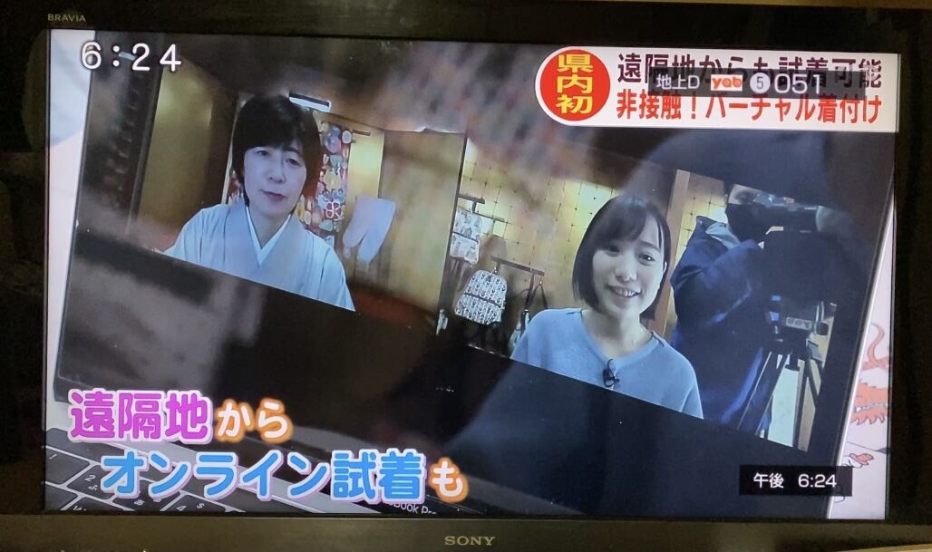 宮原キャスターが店舗で実際にバーチャル着付けを体験している様子で、